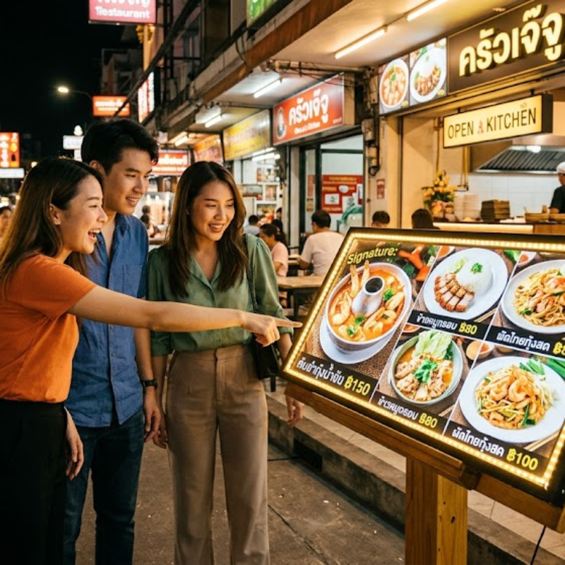 ลูกค้าส่วนใหญ่ใช้เวลาไม่เกิน 5 วินาทีในการ “ตัดสินใจมอง” หรือ “มองข้าม” ร้านของคุณ และหนึ่งในตัวแปรสำคัญที่สุดคือ การจัดวางป้ายเมนูร้านอาหาร โดยเฉพาะป้ายไฟที่ช่วยดึงสายตาได้ทันที