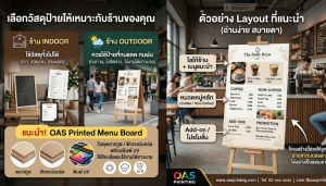 เช่น OAS Printed Menu Board ที่ใช้วัสดุพลาสวูด / ฟิวเจอร์บอร์ด พร้อมพิมพ์ UV ให้สีคมชัดและใช้งานได้ยาวนาน