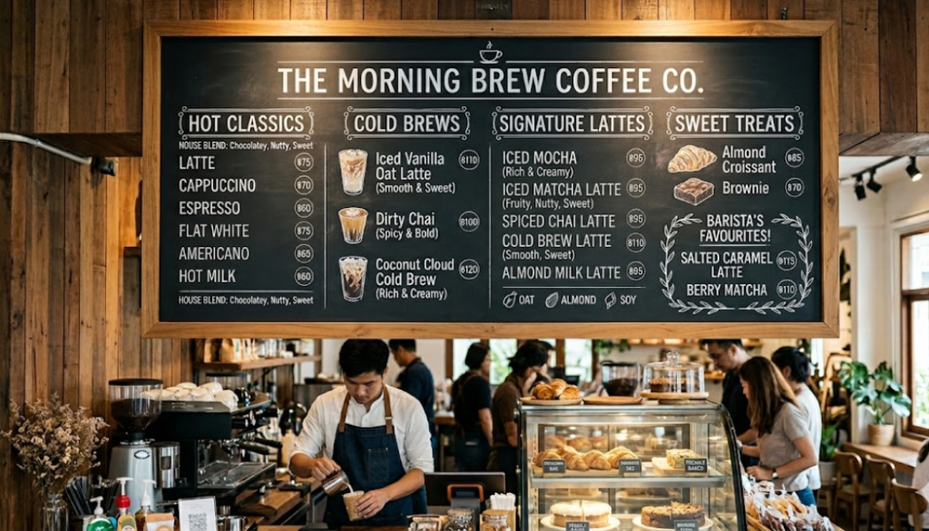สำหรับร้านกาแฟ “ป้ายเมนู” ไม่ใช่แค่รายการเครื่องดื่ม แต่คือเครื่องมือขายที่ทรงพลังมากที่สุดอย่างหนึ่ง ลูกค้าส่วนใหญ่ใช้เวลาไม่กี่วินาทีในการตัดสินใจ และดีไซน์ของเมนูมีผลโดยตรงต่อยอดสั่งซื้อ