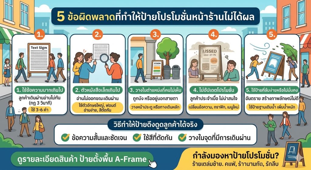 การหลีกเลี่ยงข้อผิดพลาด เช่น การใช้ข้อความมากเกินไป การวางป้ายผิดตำแหน่ง หรือการเลือกป้ายที่ไม่มั่นคง จะช่วยให้ป้ายทำงานได้เต็มประสิทธิภาพและช่วยเพิ่มโอกาสในการดึงลูกค้าเข้าร้าน