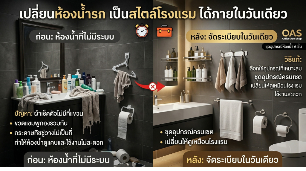 ถ้าห้องน้ำของคุณเริ่มรก หาของไม่เจอ หรือดูไม่เป็นระเบียบ การ “จัดระเบียบห้องน้ำ” ไม่จำเป็นต้องใช้เวลาหลายวันหรือรีโนเวทใหญ่เสมอไป แค่มีการวางแผนที่ดี และเลือกใช้อุปกรณ์ที่เหมาะสม เช่น ชุดอุปกรณ์ครบเซต ก็สามารถเปลี่ยนห้องน้ำให้ดูเหมือนโรงแรมได้ภายในวันเดียว