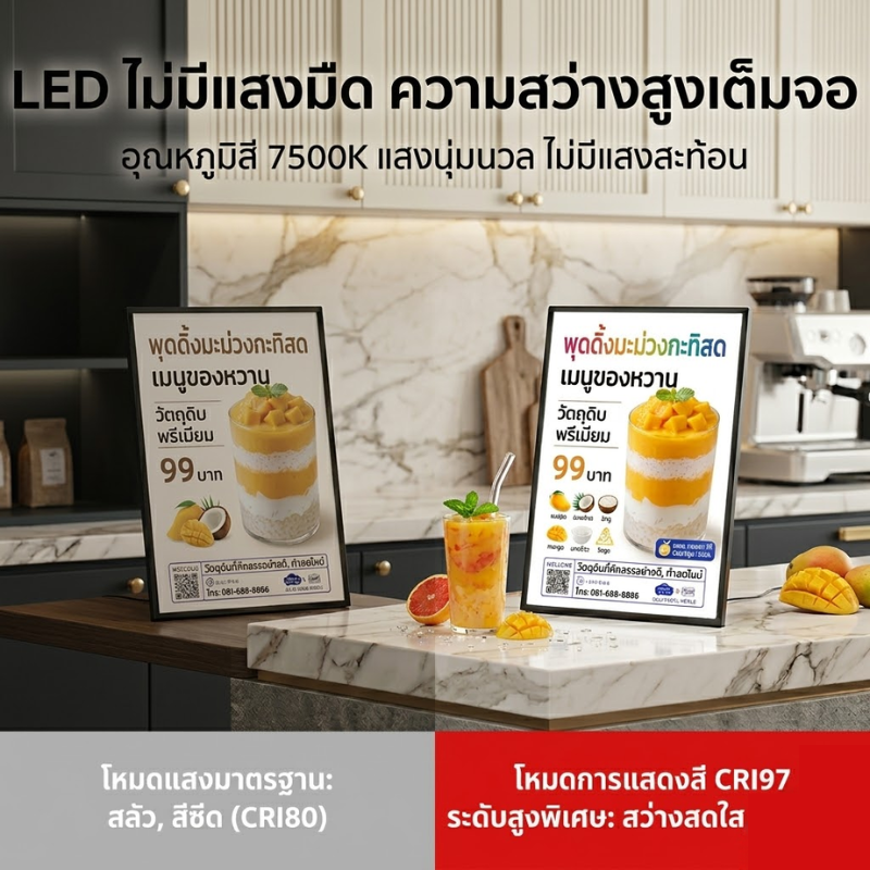 ✅ สว่างคมชัด ดึงดูดลูกค้า: มาพร้อมไฟ LED ความสว่างสูง กระจายแสงได้สม่ำเสมอ ช่วยให้ภาพเมนูดูน่าทานและโดดเด่นในทุกสภาพแสง (แถมยังประหยัดพลังงาน!)