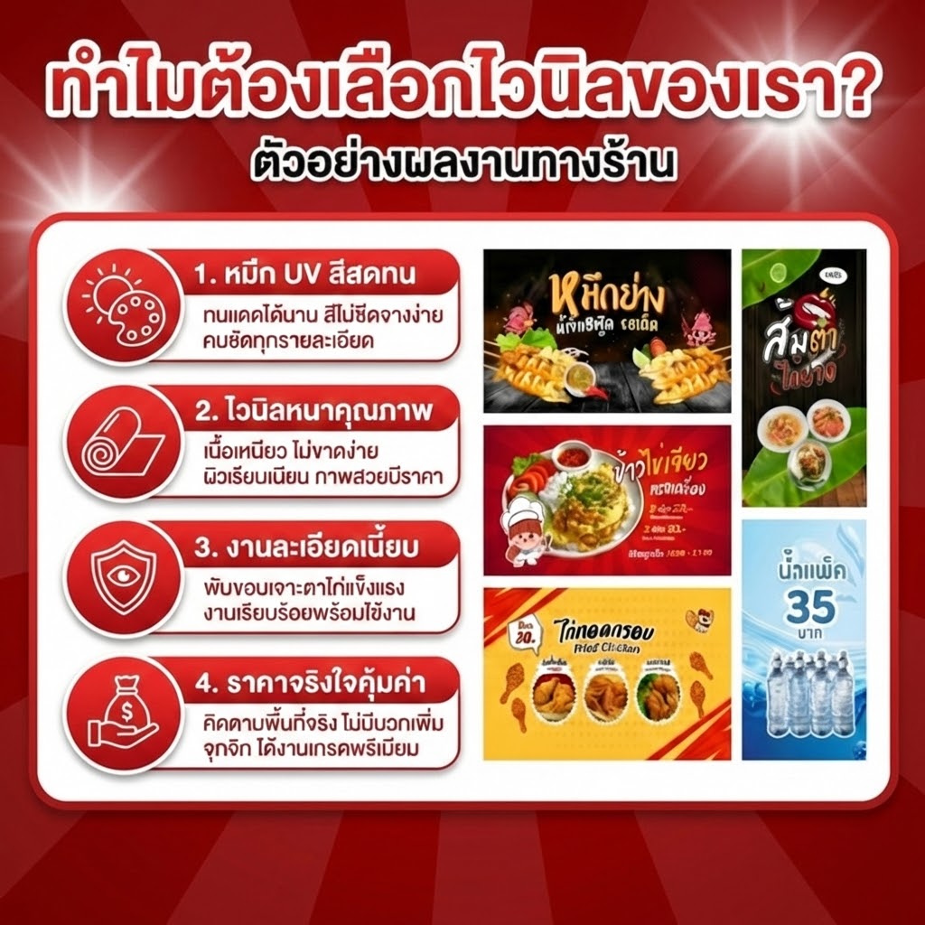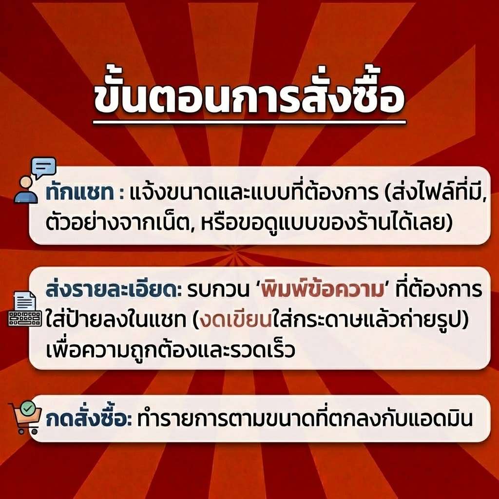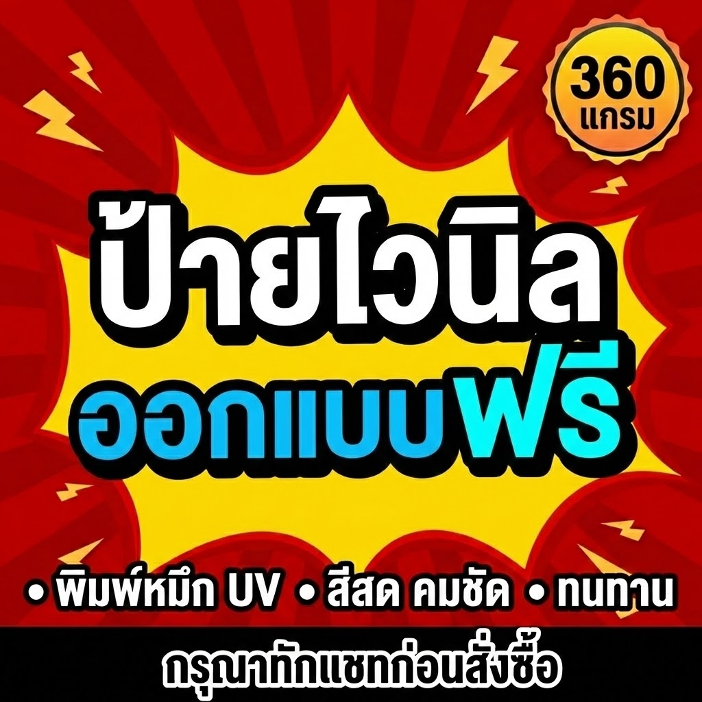 ป้ายไวนิลออกแบบฟรี ขนาดเล็ก พิมพ์ UV 360g พับขอบเจาะตาไก่ฟรี (ผลิต 1-3 วัน)