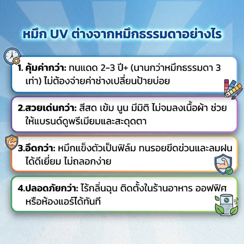 เทคโนโลยีพิมพ์ยูวี สีสด คมชัด ทนแดดทนฝน หมึกนูนสวย มีมิติ ไม่ซีดจางง่าย